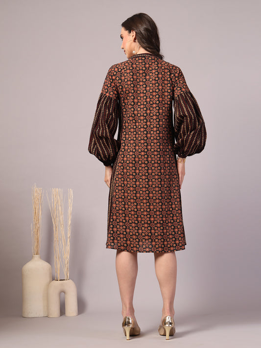 Vastraa Fusion Cotton Geometric Printed Button-Down Dress with Bishop Sleeves