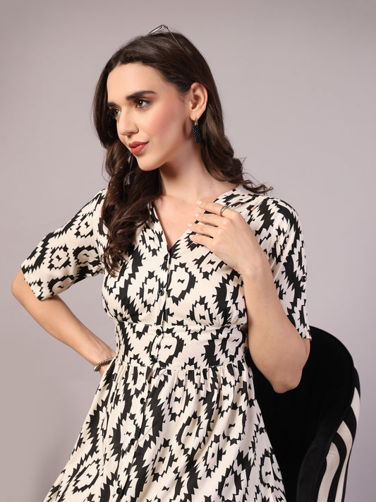 Vastraa Fusion Women's Rayon Black & White Printed Midi Flared Dress for Women