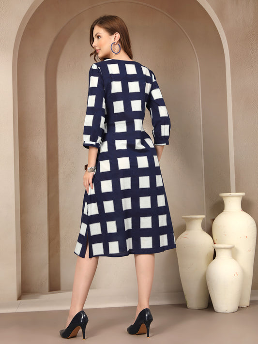 Vastraa Fusion Women Navy Blue & White Checked Cotton A-Line Dress with Belt