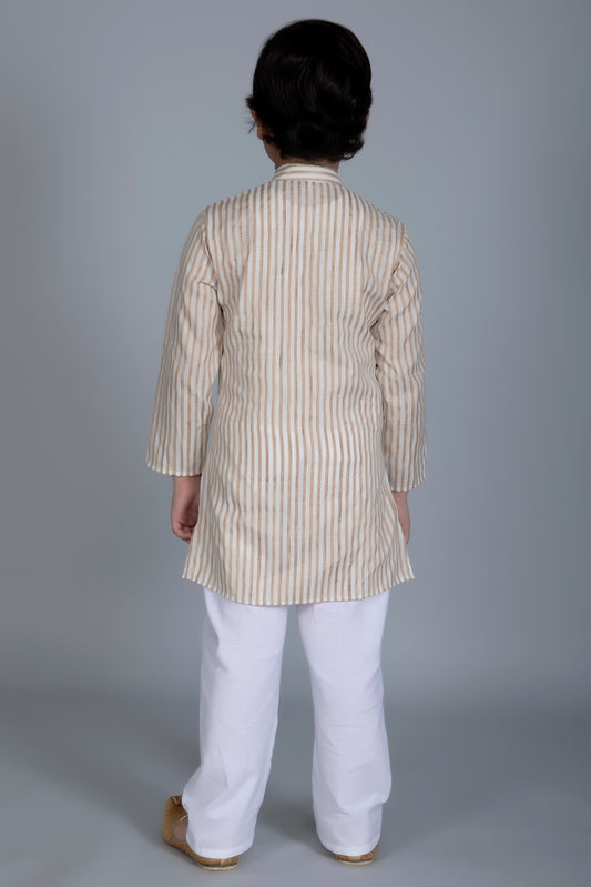 Vastraa Fusion Boy's Gold Line Handloom Weaving Pure Cotton Kurta, Full Sleeves, Wooden Button , Ethnic Wear