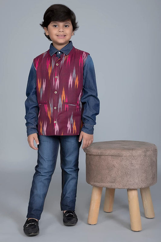 Vastraa Fusion Boys Ikat Handloom Cotton Nehru Jacket, Round Collar, Ethnic Wear Jacket