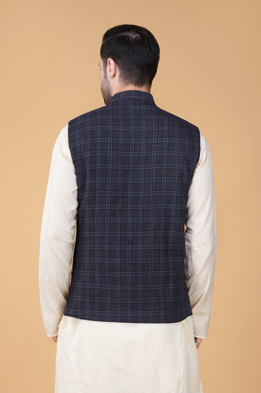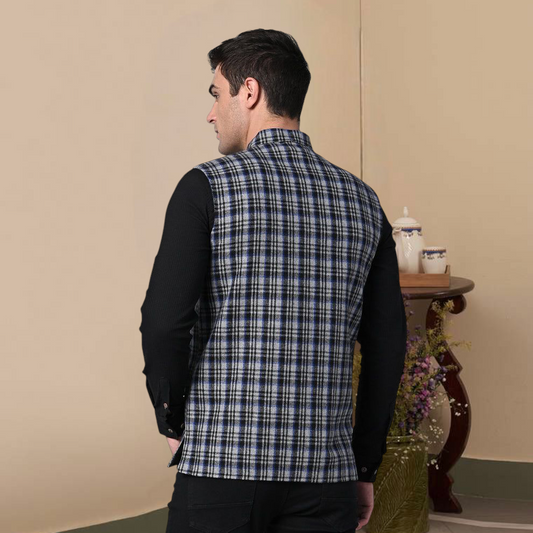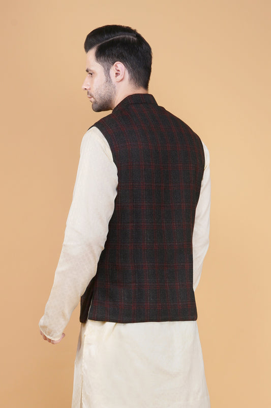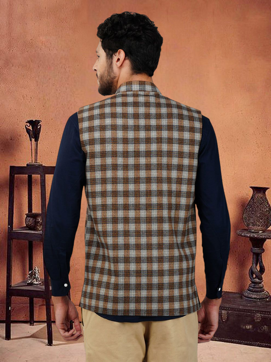 Vastraa Fusion Modi Jacket Waistcoat Checks Pattern Woolen Nehru Jacket