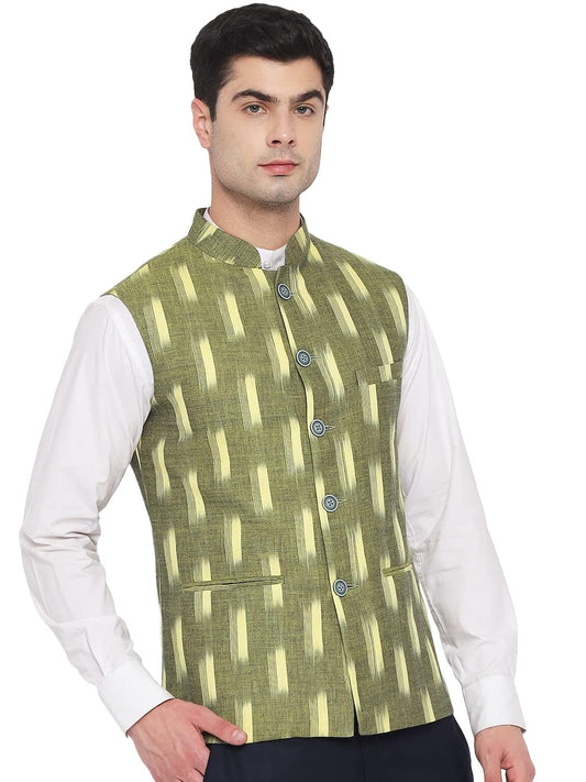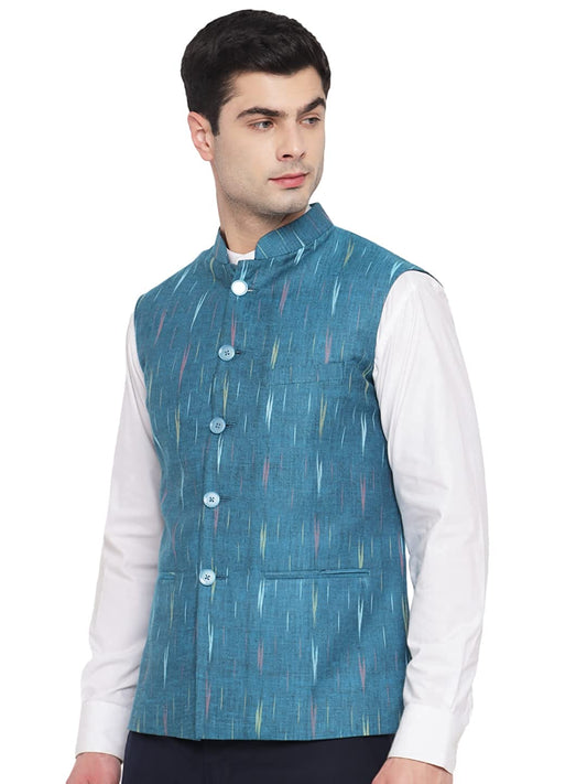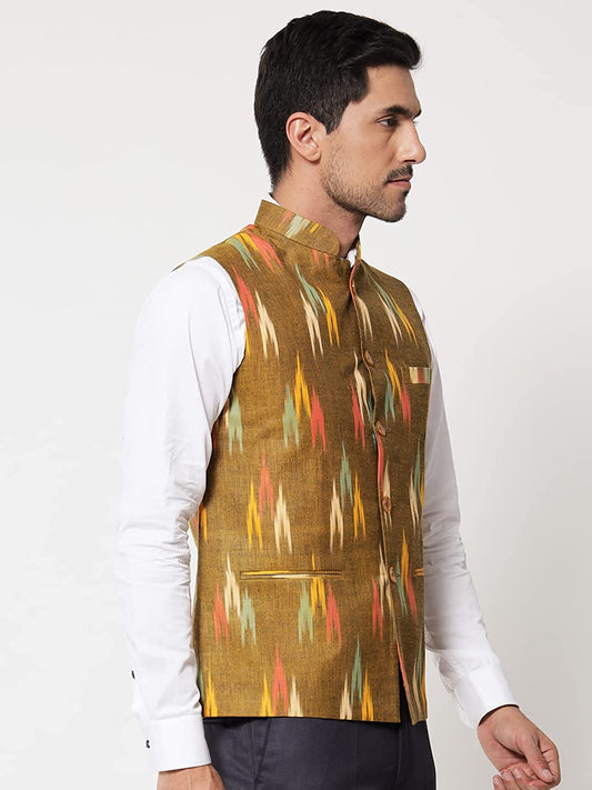 Vastraa Fusion Modi Jacket / Waistcoat - Khadi Look in Mix Ikat Patterns - South Cotton Nehru Jacket