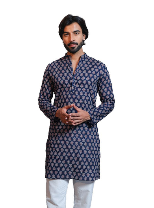 Vastraa Fusion Men's Printed Kurta Pure Cotton Long Kurta, Round Collar, Full Sleeves, Button Kurta, Ethnic Wear