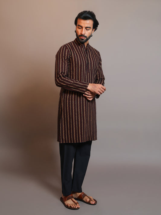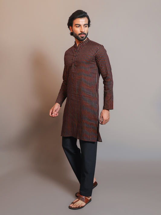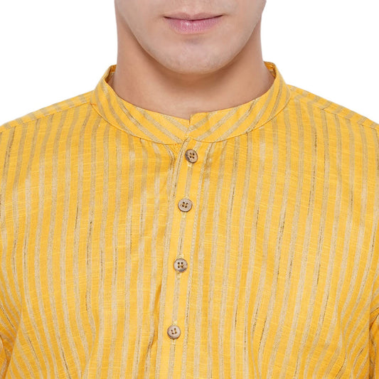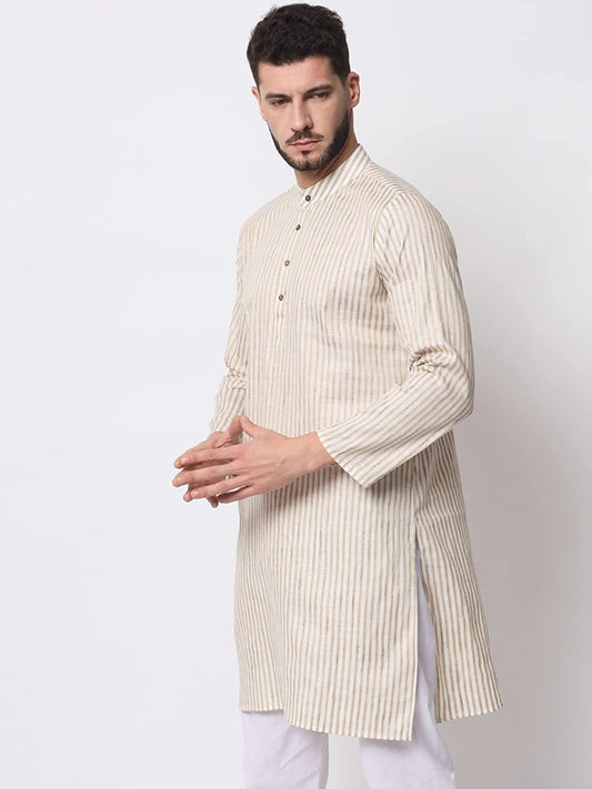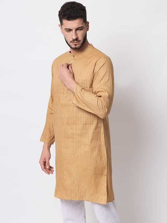 Vastraa Fusion Long Kurta For Men - South Cotton Golden Line Pattern Kurta
