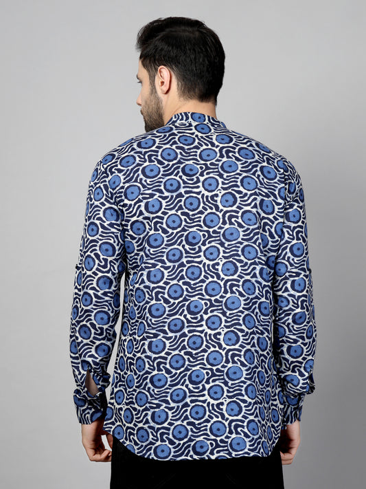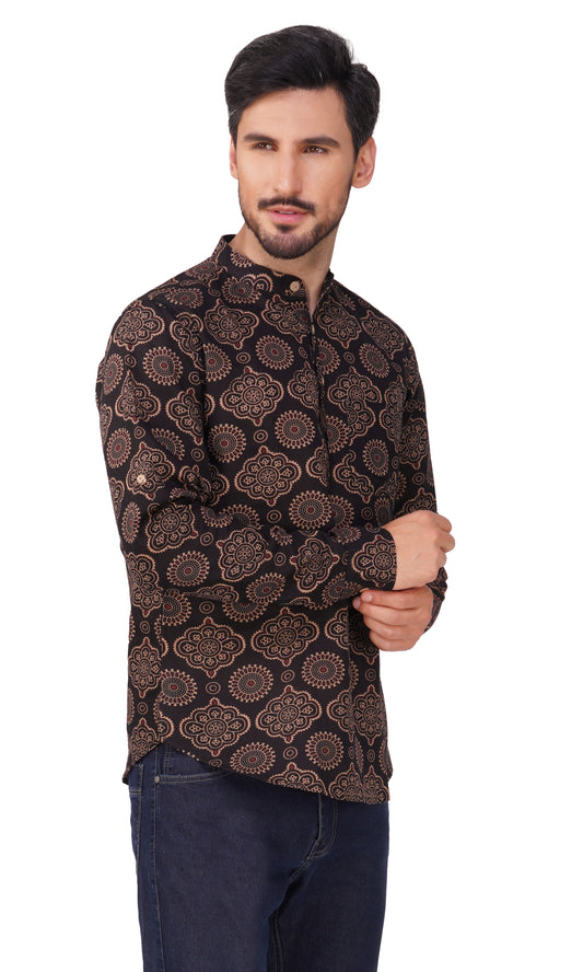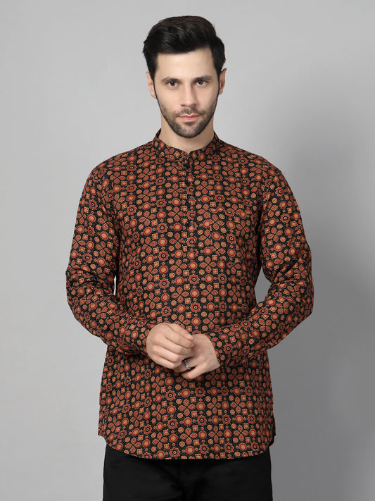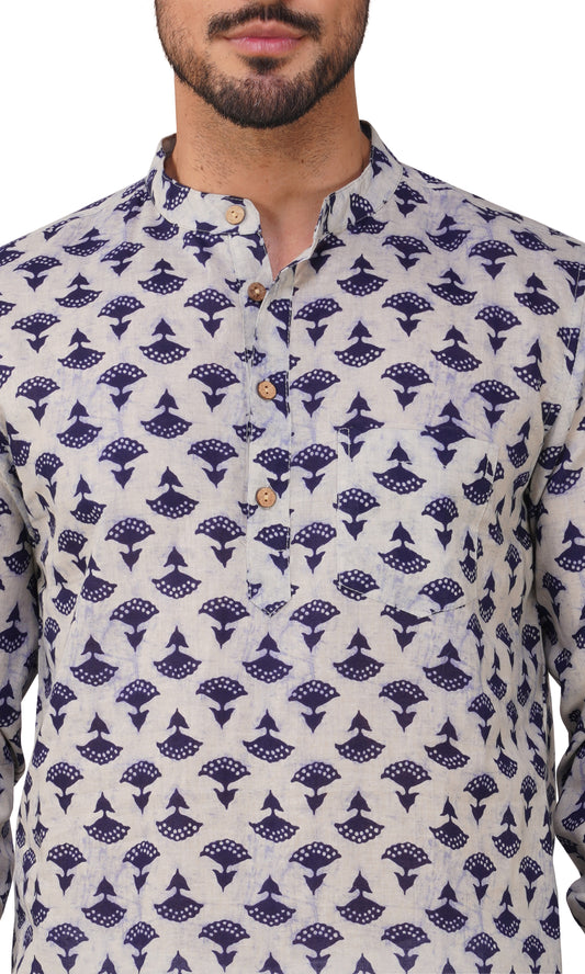 Vastraa Fusion Men's Screen Block Print Pure Cotton Short Kurta, Round Collar, Full Sleeves,Button Kurta, Ethnic Wear