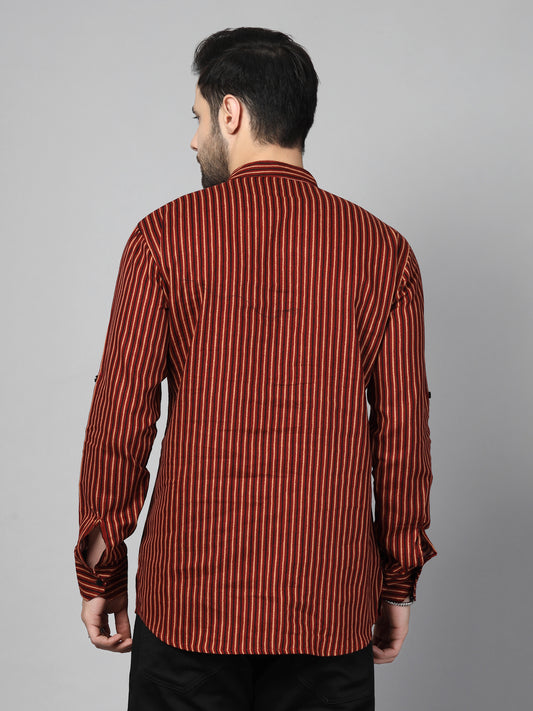 Vastraa Fusion Men's Gold Line Handloom Weaving Pure Cotton Short Kurta, Round Collar, Full Sleeves, Wooden Button Kurta, Ethnic Wear
