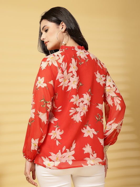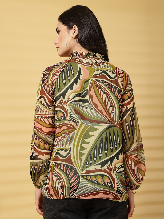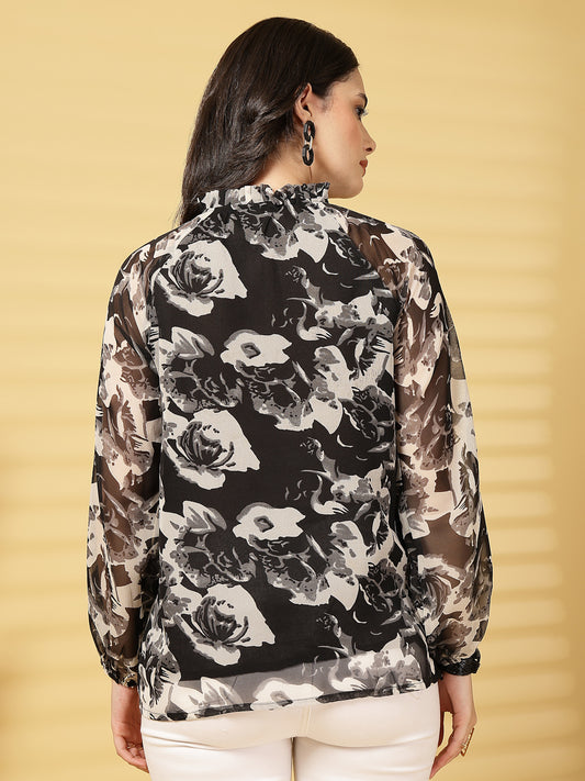 Vastraa Fusion Women's Chiffon Top Tied-Up Ruffle Neck, Sheer Bishop Sleeves, Elegant Casual Top