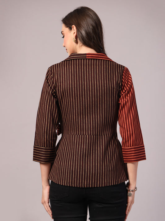 Vastraa Fusion Cotton Women's Wrap Top with Belt V-Neck Striped Shirt 3/4 Sleeve Overlapping Front Panels Top