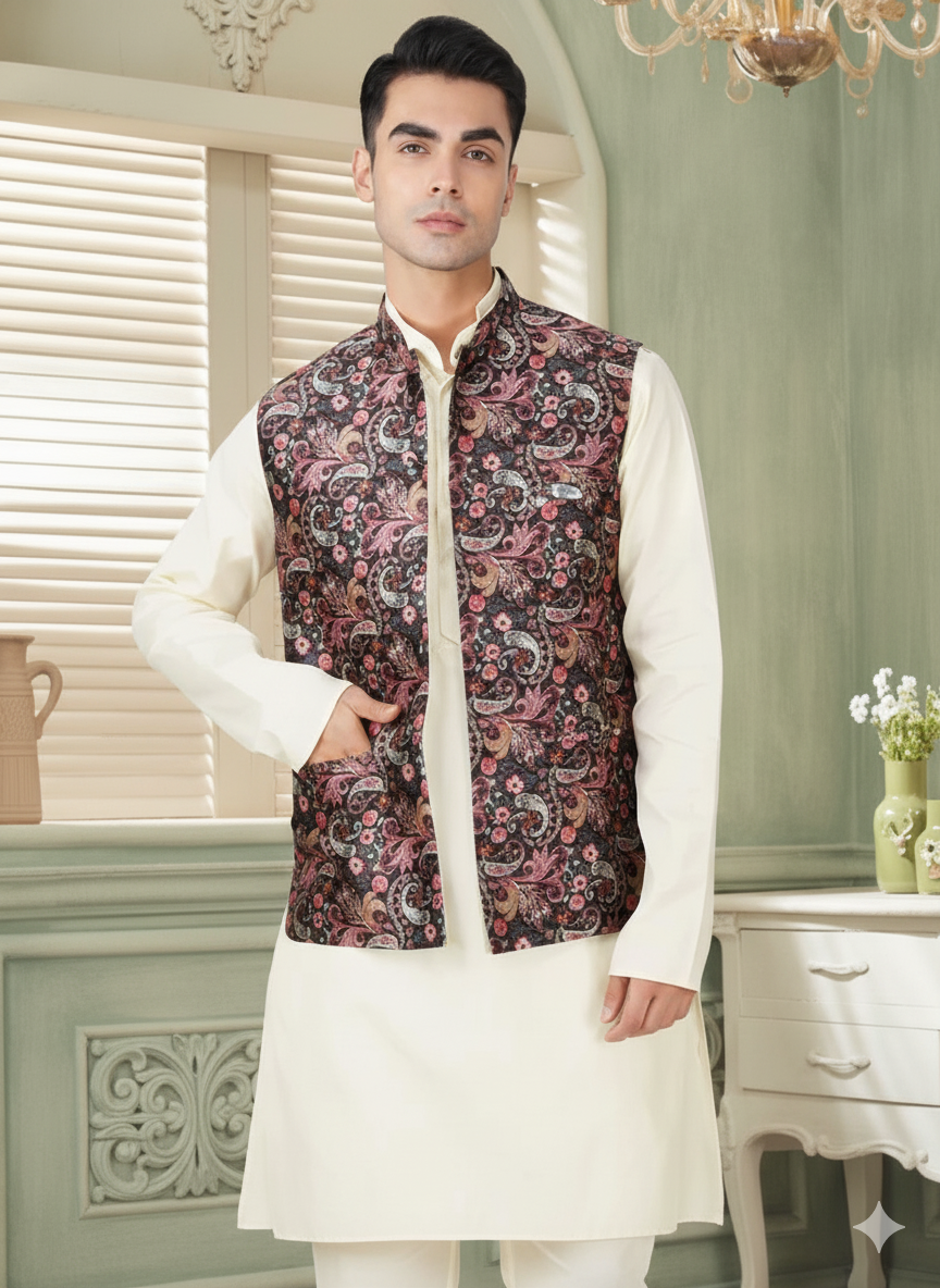 - Material: Mango Silk || Pattern: Digital Printed || Type: Nehru Jacket/Waistcoat || Length: Waist length || Sleeve: Sleeveless.