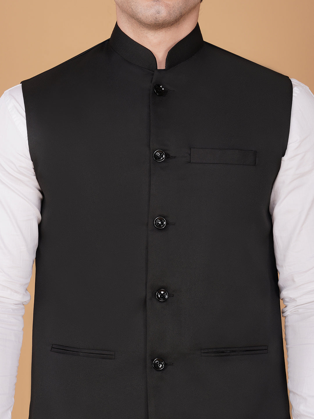 Elevate your ethnic and semi-formal wardrobe with this classic black Nehru jacket, crafted with precision for a refined and sophisticated look. Designed with a mandarin collar, sleek button closure, and multiple welt pockets, this jacket combines traditional charm with modern tailoring. The smooth, premium fabric ensures all-day comfort, while the structured fit adds a sharp, elegant silhouette. Perfect for festive occasions, weddings, office events, or casual gatherings, this versatile Nehru jacket pairs effortlessly with kurtas, shirts, and trousers to enhance your overall style.
