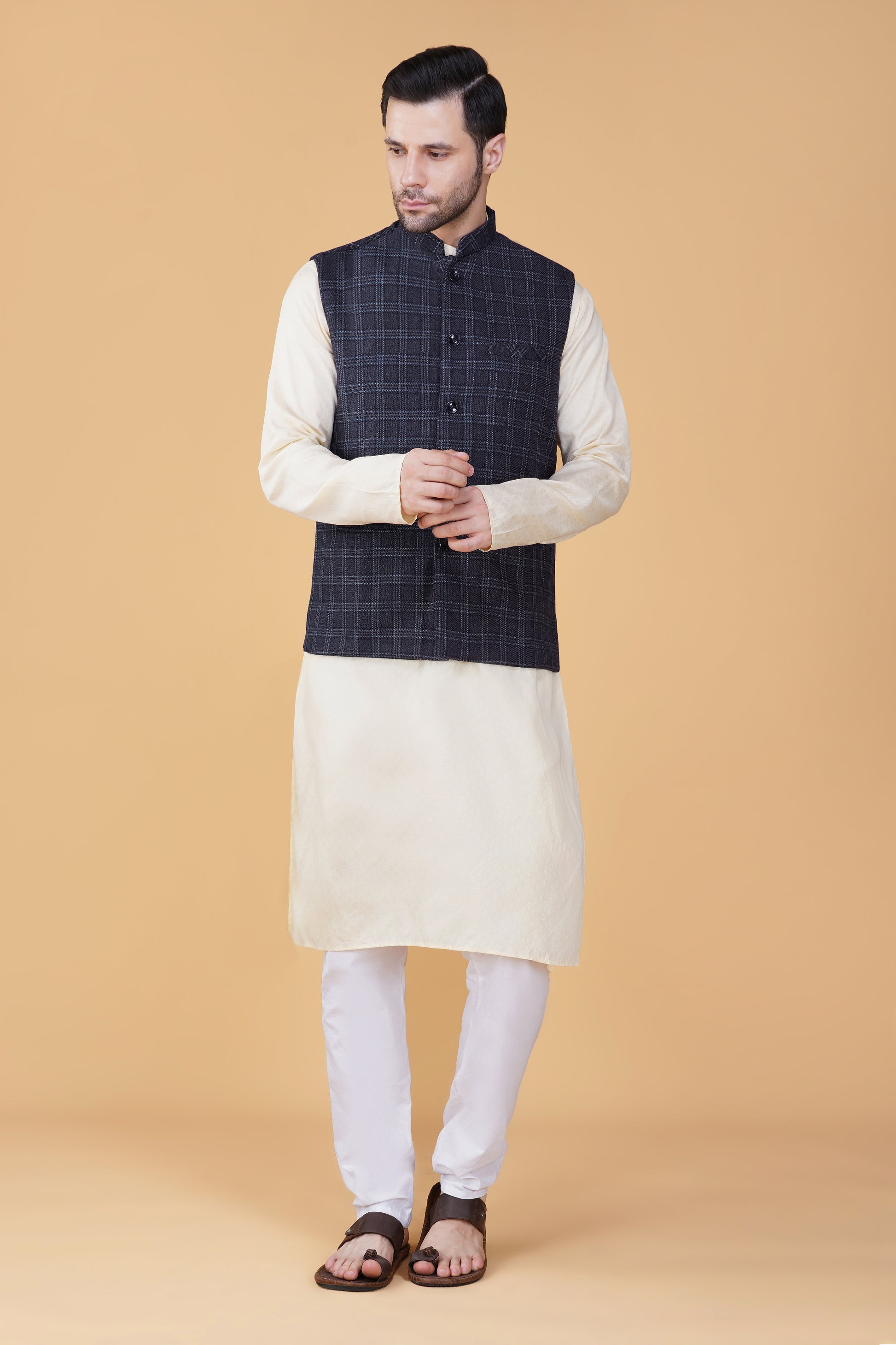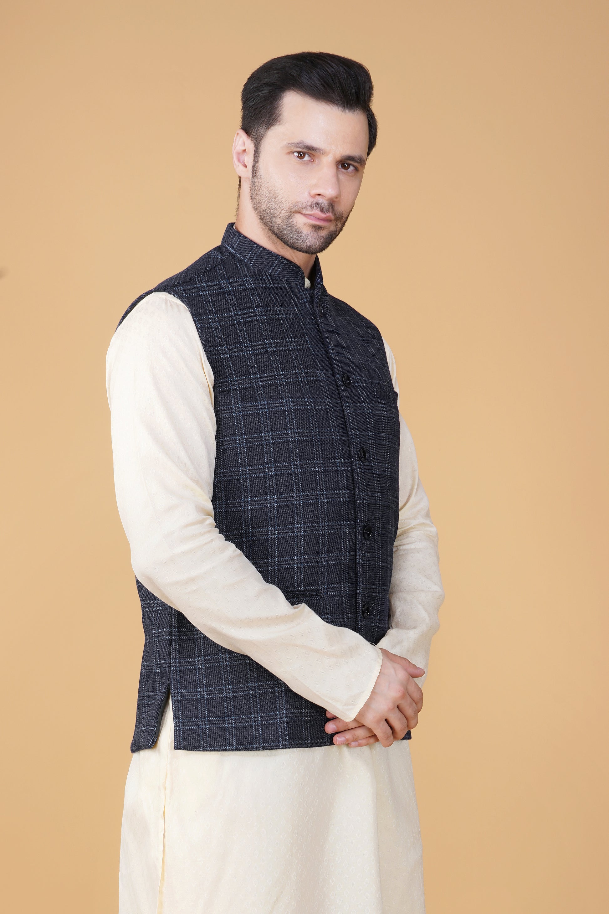 - Material: Woolen Handloom || Pattern: Block Check || Type: Nehru Jacket/Waistcoat || Length: Waist length || Sleeve: Sleeveless