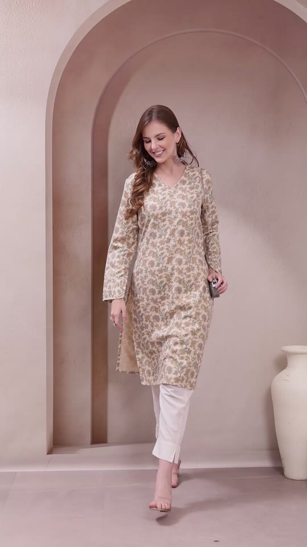 Stay cosy and stylish with this elegant woollen kurti, designed to keep you warm without compromising on fashion. Featuring an all-over floral print, this kurti comes with a flattering V-neckline, full sleeves, and a straight cut with side slits for easy movement. This versatile piece pairs beautifully with consecutive pants, leggings, or palazzos, perfect for casual outings, office wear, or everyday comfort during the colder months.