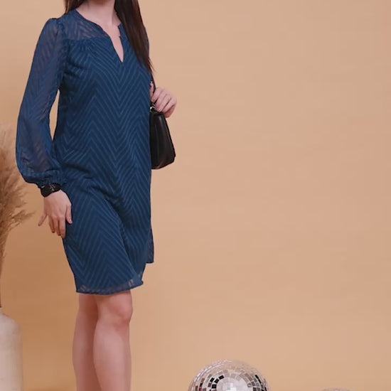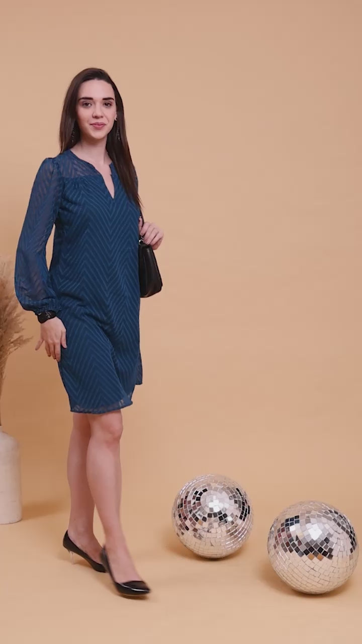 Step into effortless elegance with this women's chevron textured georgette short dress. Crafted from lightweight, semi-sheer georgette and thoughtfully half-lined for comfort and opacity, it features a subtle chevron weave that adds a modern touch. The flattering A-line silhouette with a relaxed fit suits all body types, while the stylish notch neckline and full-length puffed sleeves with elasticated cuffs bring a soft, sophisticated vibe. Falling to knee length, it's perfect for casual to semi-formal occasions. Pair it with white heels or flats and statement earrings for a chic daytime look. Hand wash or gentle machine wash recommended.
