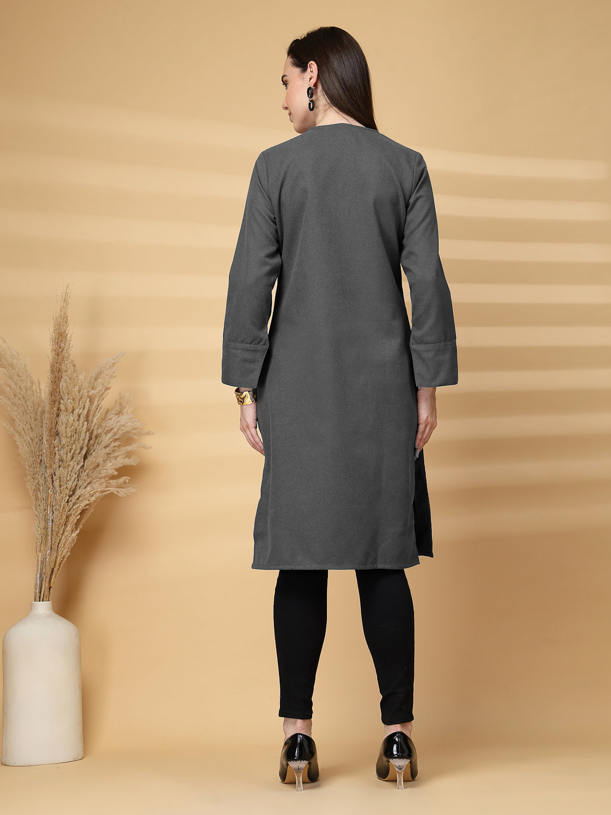 This stylish woollen kurti features a flattering V-neck, a straight-cut silhouette, and full sleeves with slit cuffs. Crafted for warmth and comfort, it’s perfect for colder months and offers a chic, modern look. Ideal for casual or semi-formal occasions.