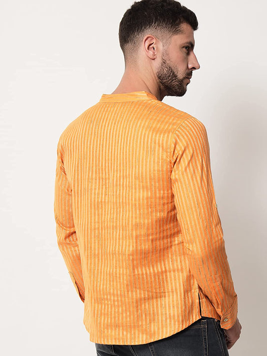 Vastraa Fusion Men's Gold Line Handloom Weaving Pure Cotton Short Kurta, Round Collar, Full Sleeves, Wooden Button Kurta, Ethnic Wear
